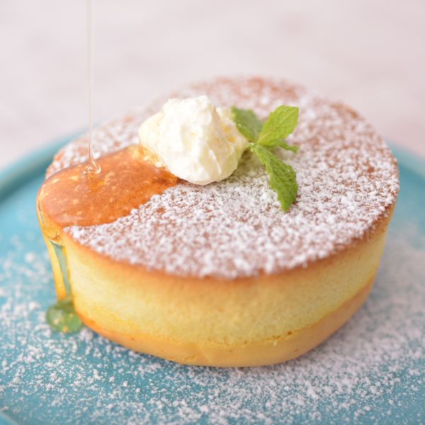 4.器にパンケーキ(1個)をのせ、2のほうじ茶ホイップ(30g)をかける。