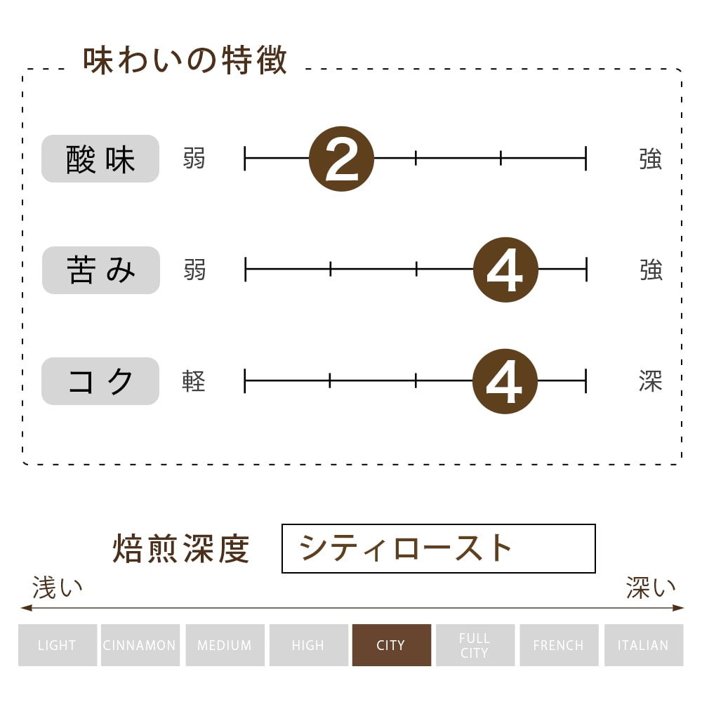 すっきりとした苦みを引き出すため 短い焙煎時間でシティローストに焙煎しています。 ロブスタ種をアクセントとして加えた 特有の香ばしさが特徴です。