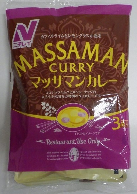 - ばれいしょ(国産)、植物油脂、ココナッツミルクパウダー、ソテーオニオン、鶏肉、砂糖、乳化油脂、魚醤、カシューナッツペースト、香辛料、カレー粉、りんごペースト、しょうがペースト、にんにくペースト、えび醤、食塩/調味料(アミノ酸)、増粘剤(加工でん粉)、着色料(カロチノイド)、(一部にえび・乳成分・カシューナッツ・鶏肉・りんごを含む)