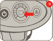 9. コーヒースイッチを押し、すすぎサイクルをスタートしてください。コーヒースイッチはオフになりコーヒーマシンは数分間、間隔をあけてすすぎのサイクルを始めます。