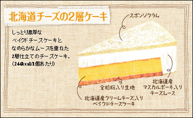 - 乳等を主要原料とする食品(国内製造)、ナチュラルチーズ、砂糖、液全卵、卵白、ビスケット、小麦粉、マーガリン、レモンジュース、ゼラチン、食用乳化油脂、食塩、卵白加工品 /トレハロース、糊料(加工デンプン、増粘多糖類)、加工デンプン、乳化剤、環状オリゴ糖、膨脹剤、香料、着色料(カロテン)
