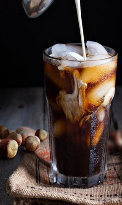 ①グラスに氷を入れ、20mlのヘーゼルナッツシロップを入れる