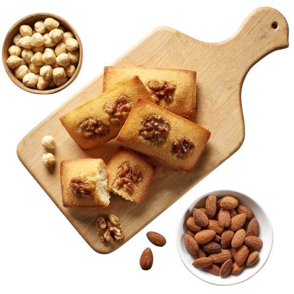 しっとりとしたフィナンシェ生地に、大きめのクルミをトッピングした食感も楽しめる焼き菓子です。
