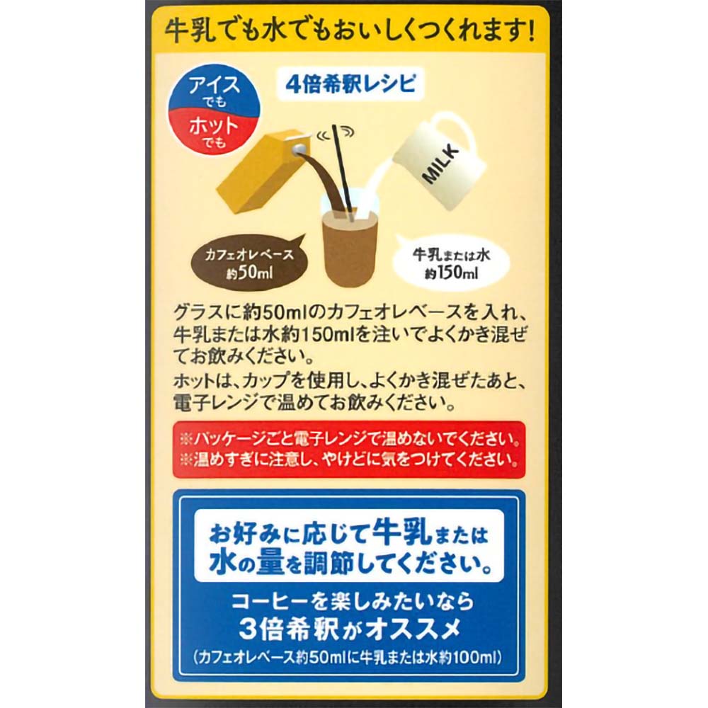 パッケージは黒を基調に、コーヒー専業メーカーが作った王道の味わいを楽しめる大人向けのデザインにリニューアル。側面では味わいの調整ができることをわかりやすく訴求しています。コーヒーとミルクのバランスを楽しみたい方は4倍希釈、よりコーヒー感を味わいたい方は3倍希釈など、自分好みの味わいでお楽しみいただけます。