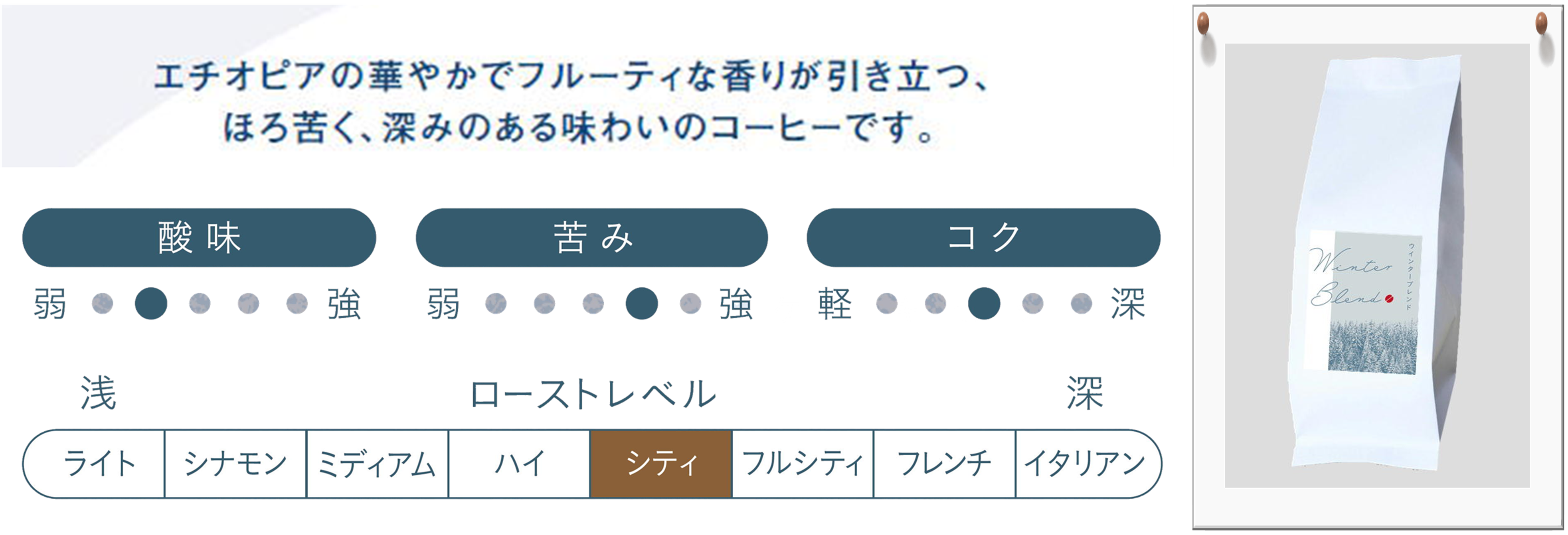 11月下旬、木枯らしが吹き始め、寒さが一段と身にしみる頃となりました。寒い日々を乗り越えるための、心温まる一杯「ウィンターブレンド」をぜひお楽しみください。