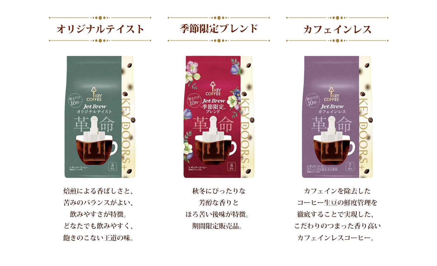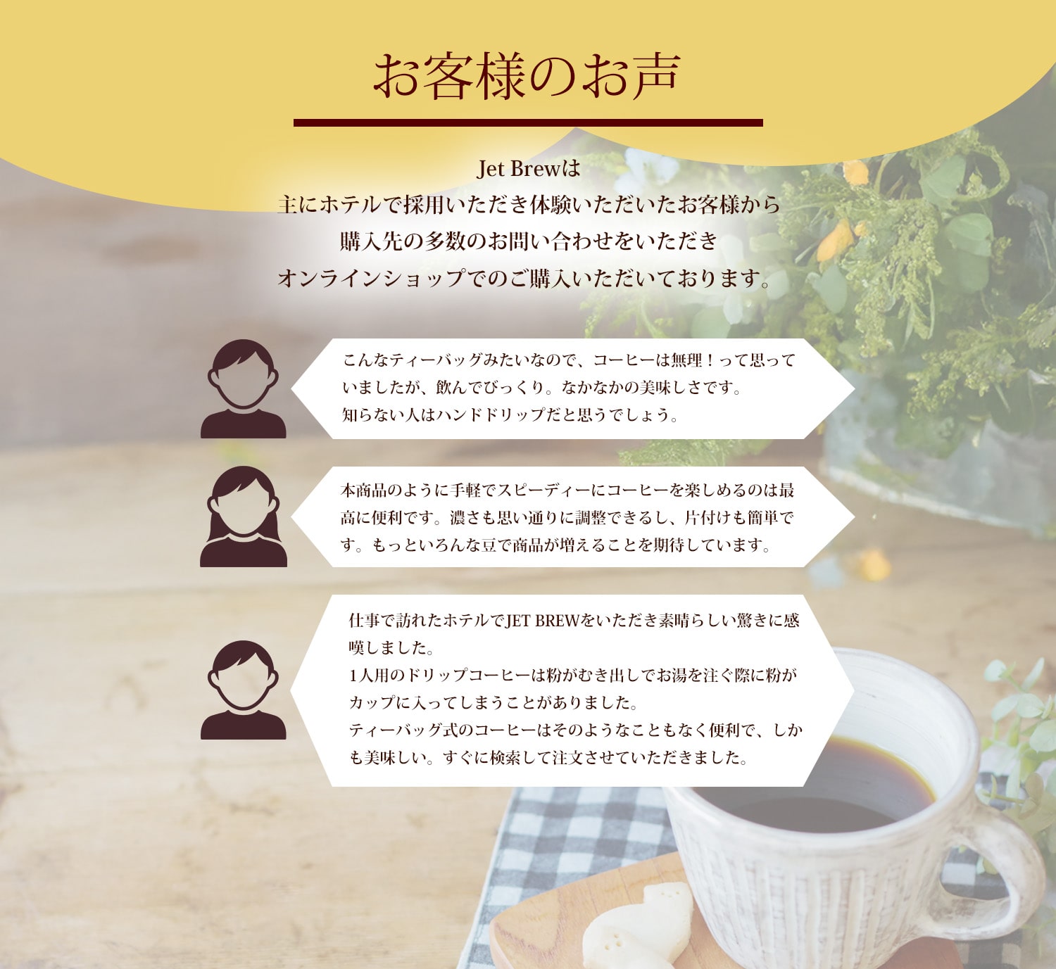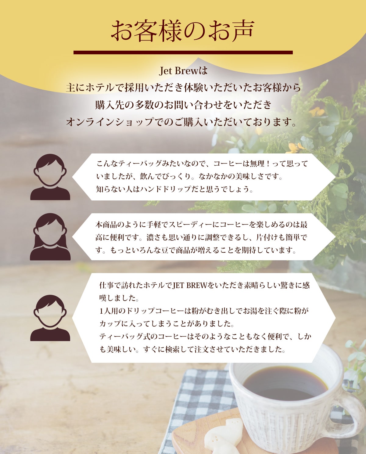 JET BREWは、「使いやすい」「粉がこぼれない」「捨てやすい」など、使用時のストレスが少ない簡易抽出コーヒーです。