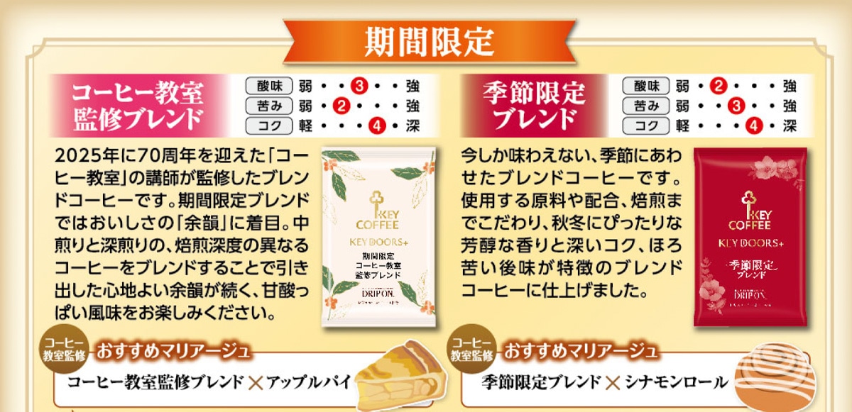 大人気のドリップ オン バラエティパックに、期間限定品として「季節限定ブレンド、コーヒー教室監修ブレンド」を詰め合わせ、6種類の味わいをお好みでお楽しみいただけます。