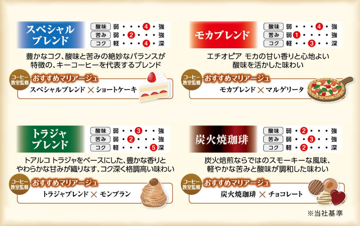 経験豊富なブレンダーがいます。ブレンドの真骨頂です。コーヒーを日頃から飲まれる方はもちろん、レギュラーコーヒーを始めようという人にも、おいしさの基準を知っていただける味わいに仕上がっています。