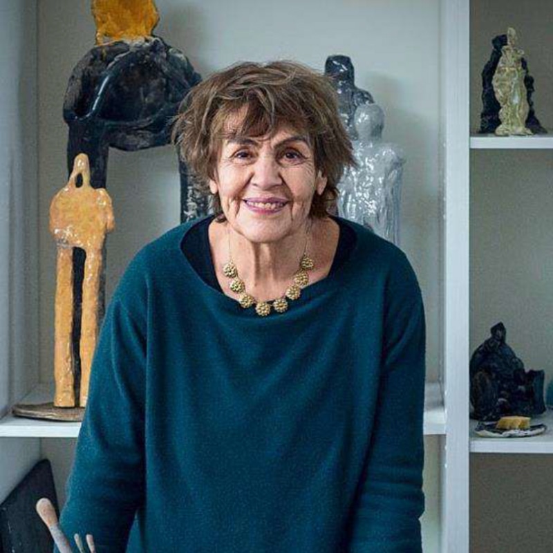 アーティストであり作家でもあるシモーヌ・ファタルは、レバノンで育ち、ベイルートのEcole des lettresとパリのソルボンヌ大学で哲学を学びました。 1969年にベイルートへ戻り、小さな住居兼アトリエで絵画や彫刻の制作を始めました。しかし、1980年のレバノン内戦の影響で、詩人・画家のエテル・アドナンとともにカリフォルニア州ソーサリートへ移住します。 そこでファタルは、革新的で実験的な文学作品を扱う出版社「ポスト・アポロ・プレス(Post-Apollo Press)」を設立しました。 1988年からは再びアート制作に取り組み始め、古代遺跡から掘り出されたような風合いの彫刻作品を数多く制作しています。 彼女の彫刻は、最小限の造形で人体を表現し、たとえば2本の太い柱が脚となり、それをつなぐ粘土のかけらが胴体や頭部となるといった具合です。わずかな傾きが「動き」や「身振り」を表現することもあります。 これらの作品は、人間の精神のかたちを物質として具現化する試みであり、本質を探しながらもそれを否定するような二重性を持っています。